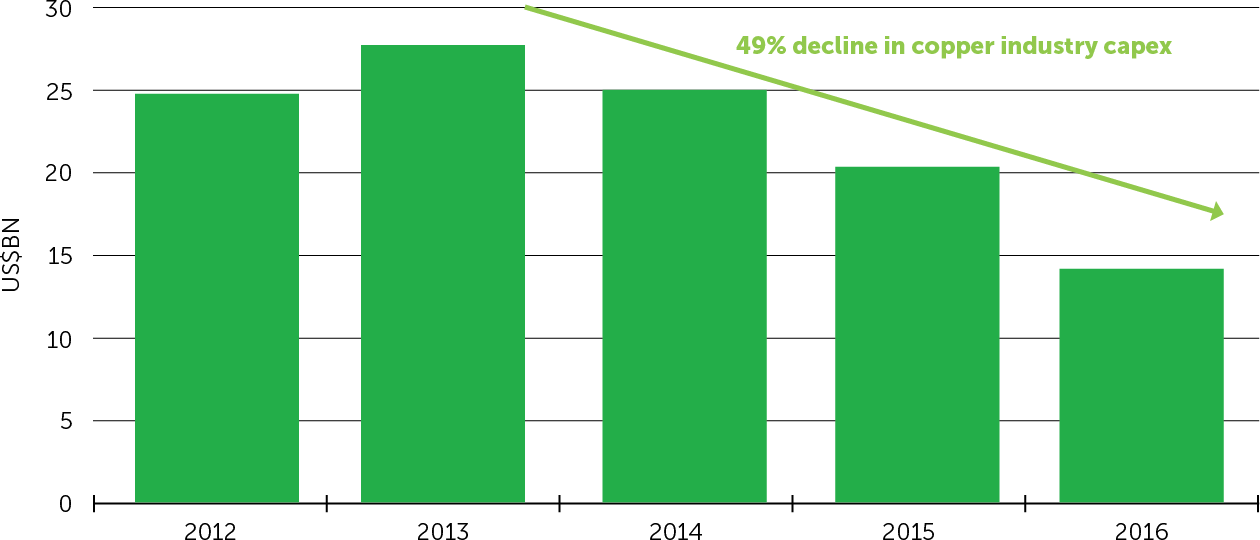 Between 2013 and 2016, capital investment in copper projects by industry majors fell 49% from just under $28bn to $14bn.
